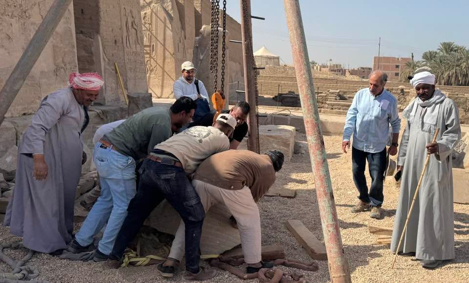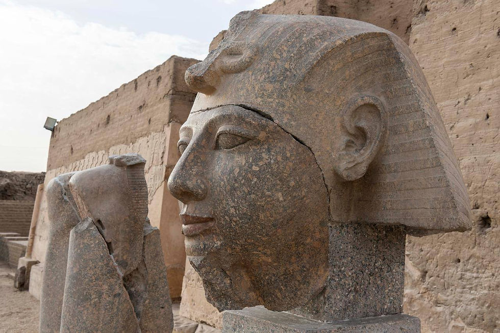 Отреставрированная голова колоссальной гранитной статуи Рамсеса II вновь украсила вход в заупокойный храм царя в Абидосе.